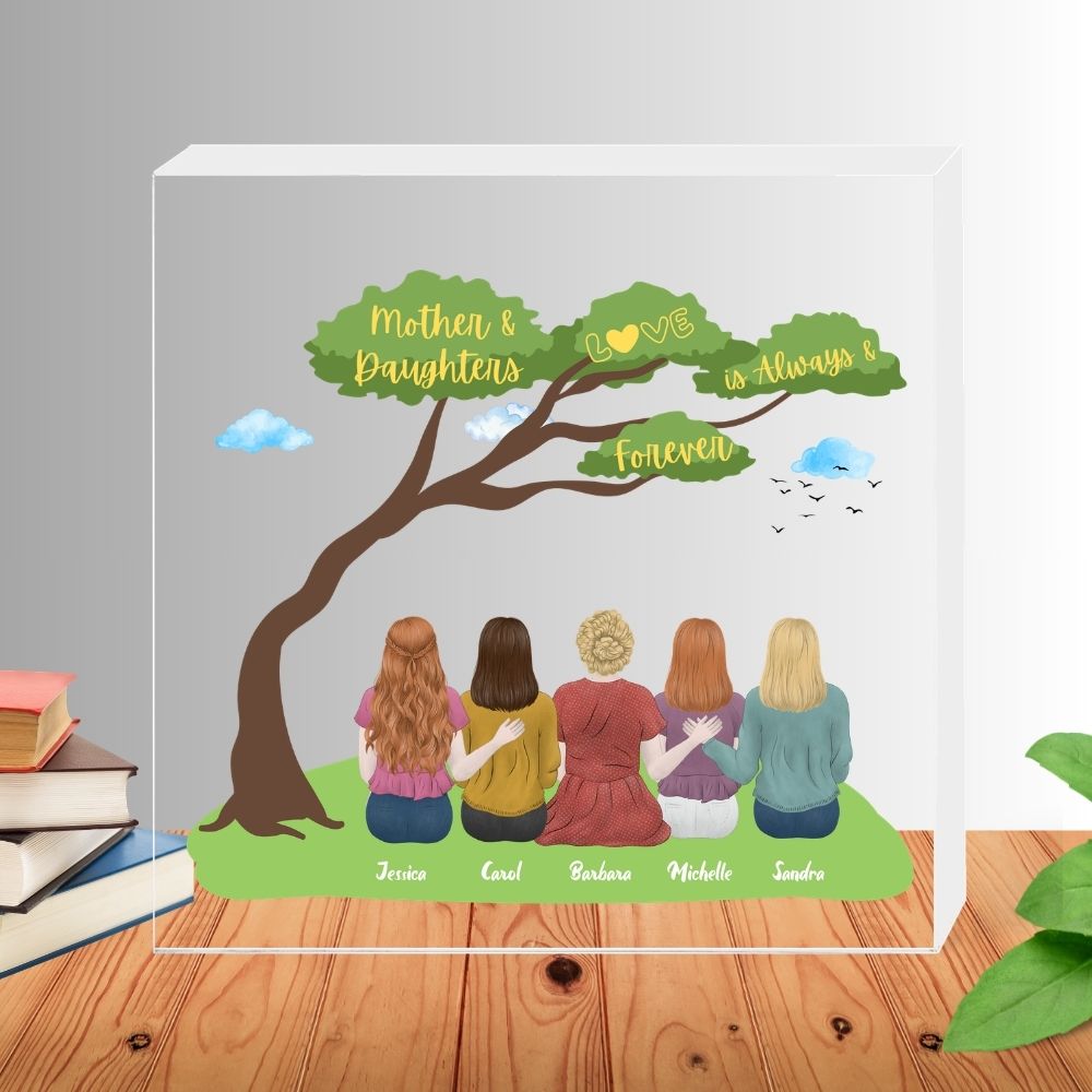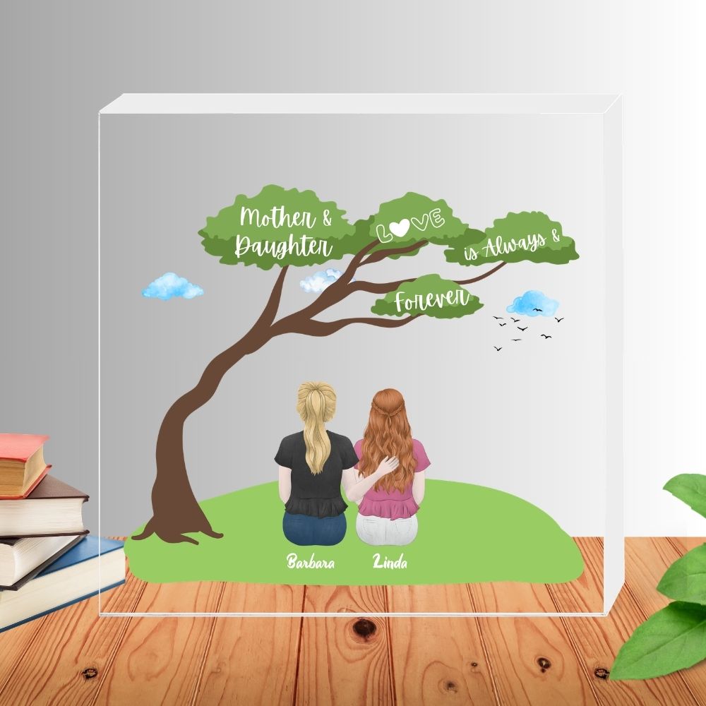 The plaque is elegantly mounted on a 6x6 inches acrylic block base, allowing you to add a warm, inviting glow to any space. Choose from a selection of pre-made pencil-style clipart to personalize your piece, making it a unique tribute to the everlasting love and deep connection shared between mothers and daughters.